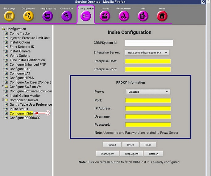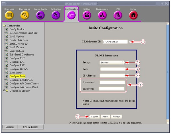 note: The Configure Insite page is used to submit an RSvP connection request. The required data entry depends on the customers network configuration with DNS and possible Proxy Server. Enter the customer network information into Insite Configuration input fields, that correspond to customer configuration.