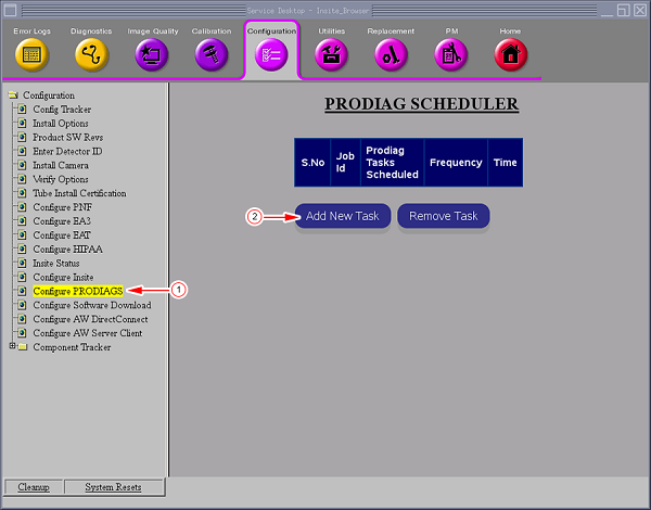 1. Click Configure PRODIAGS [1] link on the CSD, if no prodiag task is in the PRODIAG SCHEDULER, the UI displays like the screen shown below: