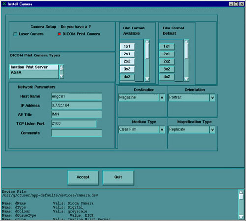 A second screen, Figure 3, with image quality and timeout information parameters for filming sessions, comes up after selecting ACCEPT. Figure 3, below, is an example of the required image quality and timeout parameters for a DICOM Print Camera: