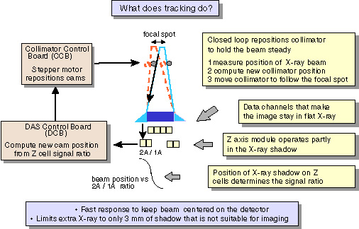The purpose of tracking is to follow the focal spot so that we can keep the uniform X-ray of the narrowest possible beam on the detector to reduce dose and still avoid artifacts. The focal spot moves in Z due to thermal changes in the tube and a mechanical forces during gantry rotation and tilt angle. Each cam is basically an independent system.