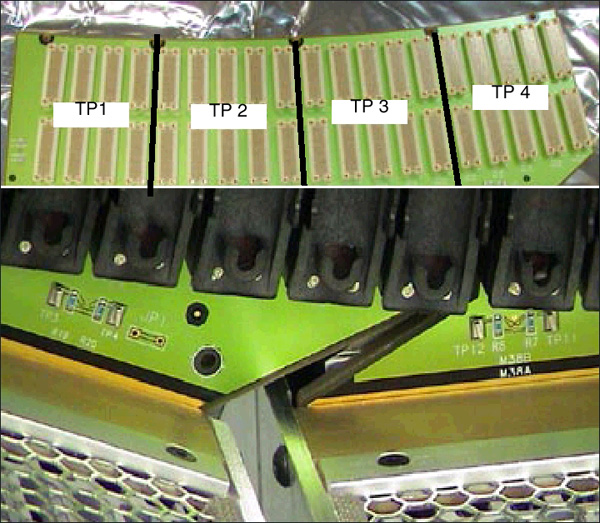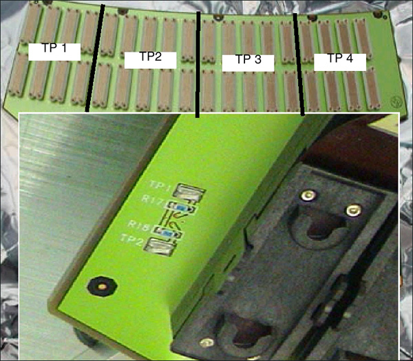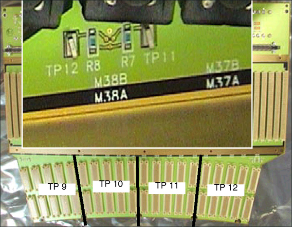 Each distinct backplane has been divided up into 4 groups of modules, each group having its own limiting resistor and test point. This is to make finding the shorted module easier. Each test point is referenced to the DAS center chassis TP 4 AGND test point.