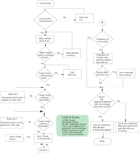 Like Tube Warmup, Fast Cal is another daily preparation function. Running Fast Cal generates new Acal, Sine, and Cosine vectors used in the preprocessing stages of image reconstruction. FastCal should be run daily to maintain optimal image quality.