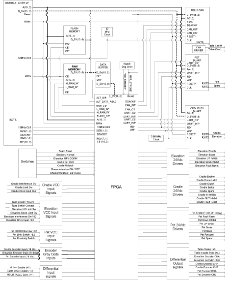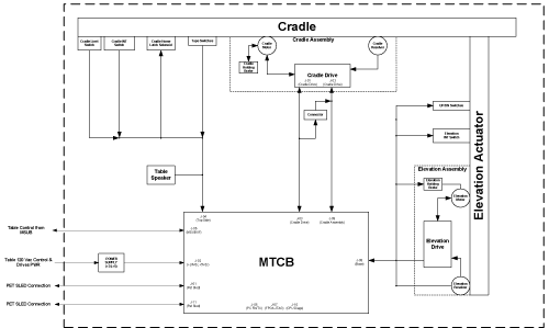 The MTCB interfaces with the MSUB and TGP boards and re-directs necessary communication to the Cradle Drive and Elevation Drive. The MTCB facilitates the following major functions: