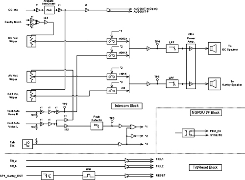 The Intercom block enables communication between the console operator and the patient on the table. The communication direction through the Intercom can be switched by depressing the TALK button on the SCIM keyboard. The operator can speak to the patient by depressing the TALK button (ON). When the TALK button is released (OFF) the operator can then listen to the patient.