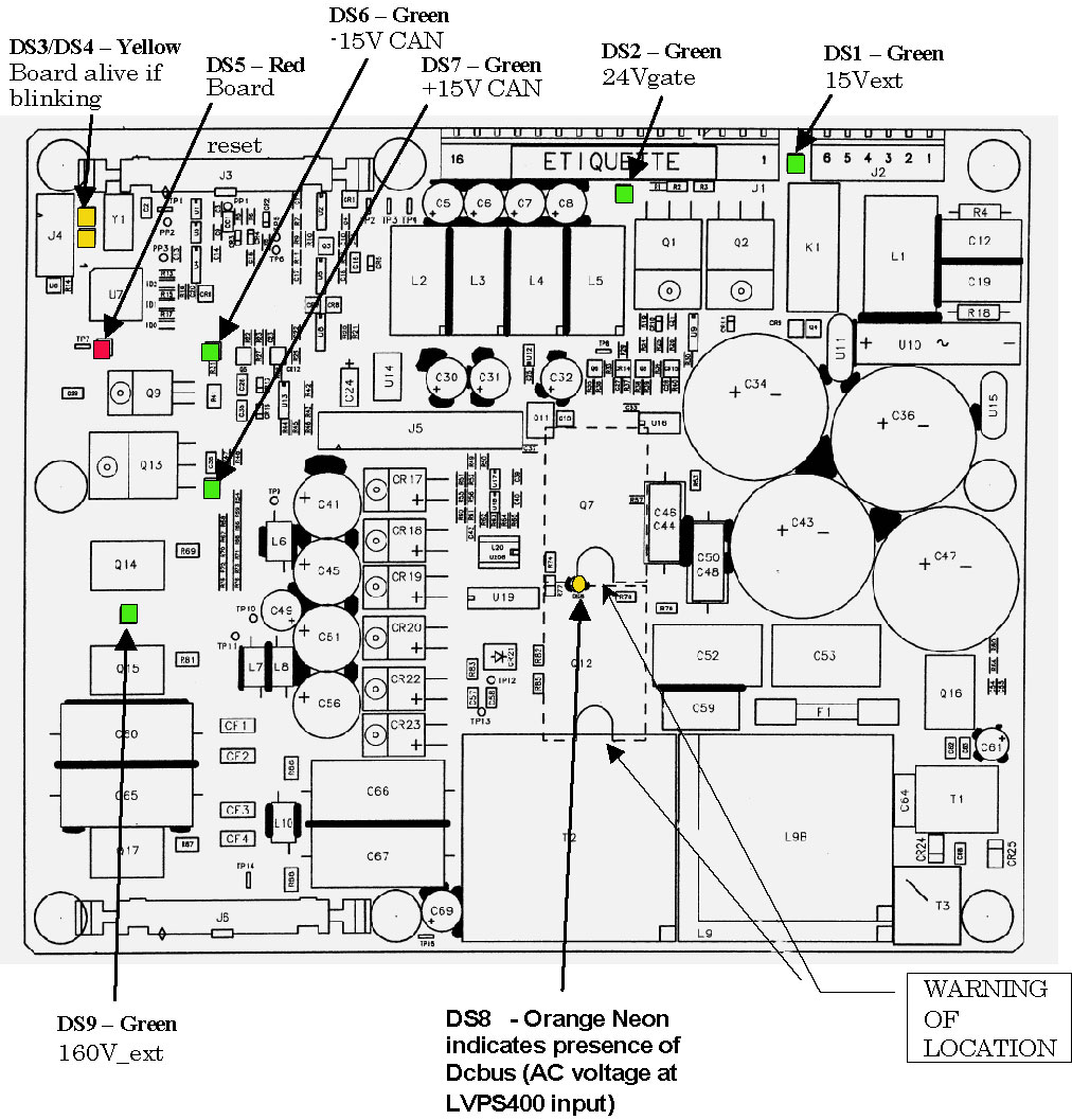 After the power on diagnostics, LVPS400 board LEDs DS3 and DS4 are lit successively. Any different status corresponds to an abnormal situation. An error code is logged. Refer to error code description.