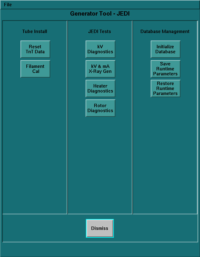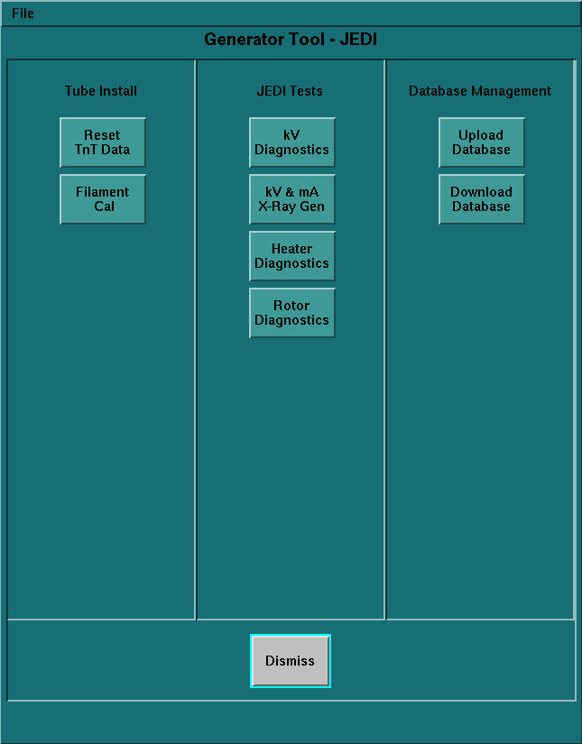 The JEDI Generator Tool is launched from the Common Service Desktop by clicking CALIBRATION > GENERATOR CHARACTERIZATION. This tool contains many key service features for the X-Ray Generation subsystem.