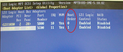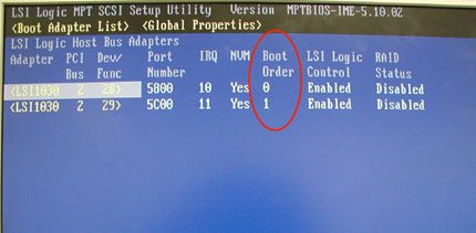 In the LSI Logic MPT SCSI Setup Utility, select the adapter which is identified by “Boot Order 0” (Figure 10) and press Enter to access the Adapter Properties menu.