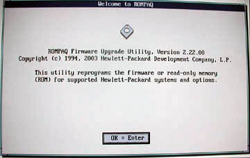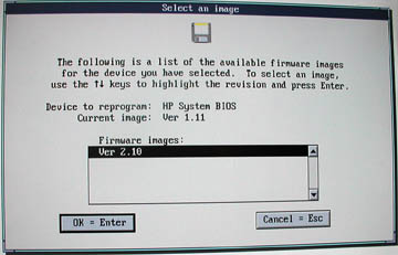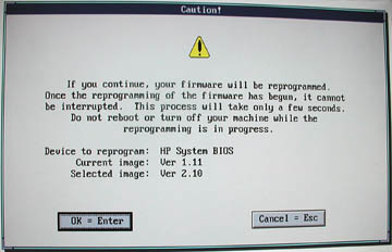 At the Caution! screen (Figure 4), verify that HP System BIOS is shown for Device to reprogram and Ver 2.10 is shown for Selected image. Then press Enter.