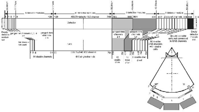 The Watson 16 detector has total 57 detector modules, 912 detector channels which are used to connected with Pancake DAS. Pancake DAS data channel number is 768ch, which is the same as GDAS16. This is achieved through digital ganging the 912 detector channels to 768 DAS channels (The ganging is done after A/D conversion).
