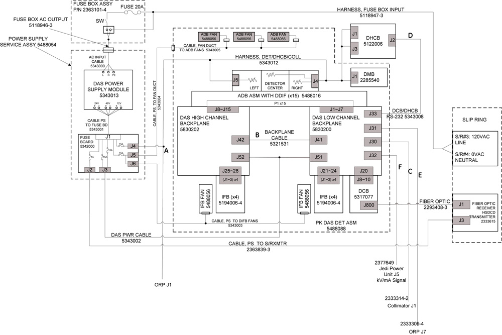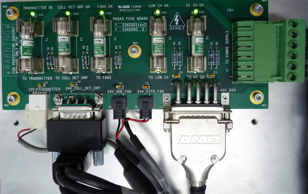 The Fuse Board provides a central point for fuse protection and distribution of 48Vdc power to the rotating harnesses and loads on the gantry. The board is powered by the main rotating 48Vdc power supply. The loads served by this board are: DAS, Collimator, DHCB, ORP & Slip-Ring Transmitter.