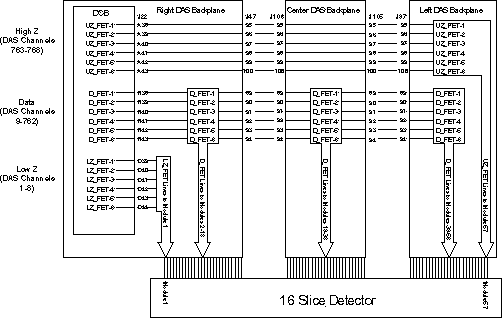 The Detector FETs (Field Effect Transistors) are used as switches to combine detector rows, to achieve the prescribed slice thickness. These FETs are physically located in the detector assembly.