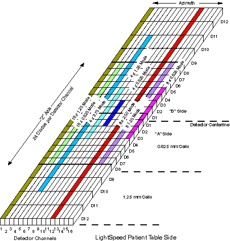 The detector assembly used on this system houses 57 Detector Modules (Figure 1). Each module has two sides-an A-side and a B-side (refer to Figure 2, “LightSpeed 4.X Detector Module,”) - with twelve (12) diodes or cells per channel per side. Cells are labeled D1 through D12, for a total of 24 cells across the detector face (both A and B sides). Note, there are sixteen (16) 0.625 mm cells, eight (8) per side and eight (8) 1.25 mm cells, 4 per side. The 1.25 mm cells comprise the four (4) outer rows on both A and B sides. It must further be noted that only 16 cells per channel are active during any given data collection.