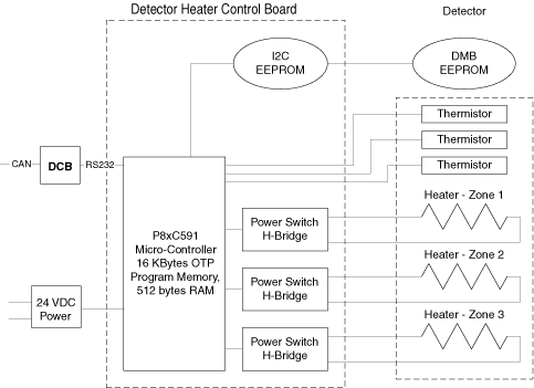 The primary function, provided by the 8xC591 microcontroller, is to perform basic control and monitor of temperature in three zones of the detector and report status, faults and errors to the system via the DCB.