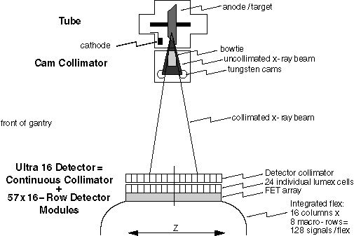 The detector is segmented into cells in the Z dimension. Post-patient collimation is provided by the segmentation of the detector cells, not by a separate post-patient collimator (see Figure 3). The post-patient collimation, along with summation of cells in the Z direction by the detector FET array, determines the Z-axis slice thickness of the scan data.