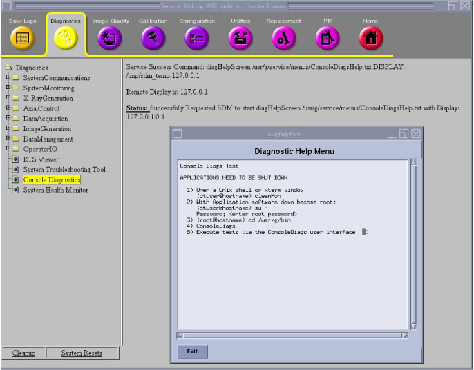 To access the Common Service Desktop, click on the Service icon, then Diagnostics, then Console Diagnostics. (See Figure 1.) Instructions are provided to shut down applications and perform manual entry in a Unix shell to invoke the diagnostic tool.