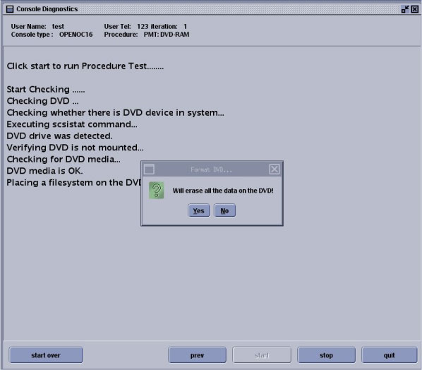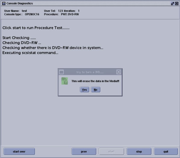 Whenever Test MOD or DVD is selected the media inserted/ warning screen will appear. This screen informs the user that the content /data of any media installed in the MOD Tower or PMT (Peripheral Media Tower for DVD) will be lost/destroyed. Additionally, the user is informed that the System State should or write-protected media should not be used. Some users may have issues with media containing DICOM.