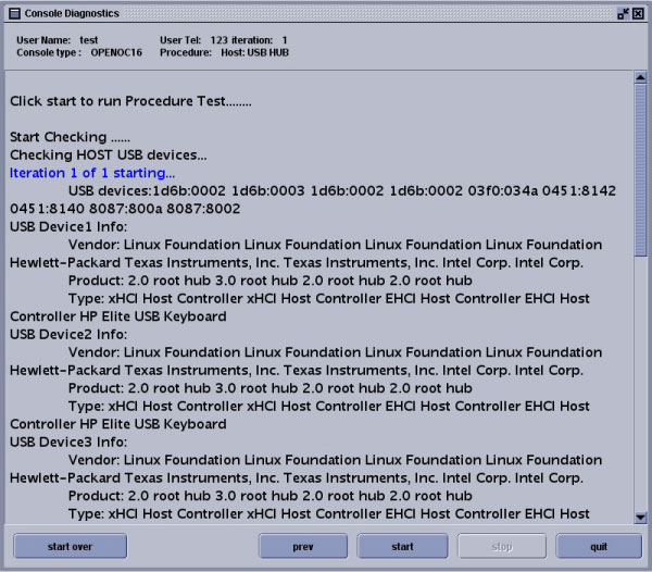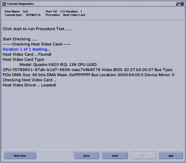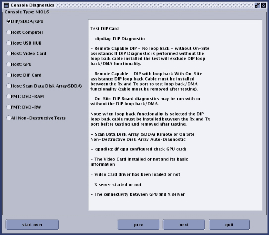 Click on the Next button to move forward. The Previous button allows the user to return to a previous screen. The Cancel button cancels the Auto-Console diagnostic script and allows the script to perform the clean-up process. The Start Over button places the user at the Auto-Configuration Screen.