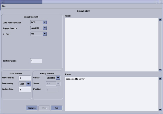 Gantry – Disabled is the default, Enabled opens the Speed field for the user to select a rotation speed, Position opens the position field to allow the user to select a specific tube position (typical for slipring antenna troubleshooting). Gantry rotation enabled or position selected requires a Scan button press to initiate the test.