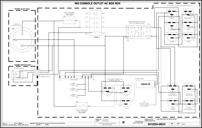The AC Box in the top compartment of the Operator Console is responsible for distributing AC Power to the components in the Console. Incoming power from the AC Unit (PDU) of the CT System is two (2) phase 208 Vac. This incoming 2 phase AC power is routed through Line Filters and Circuit Breakers and then sent to numerous IEC power outlets in a load balanced manner.