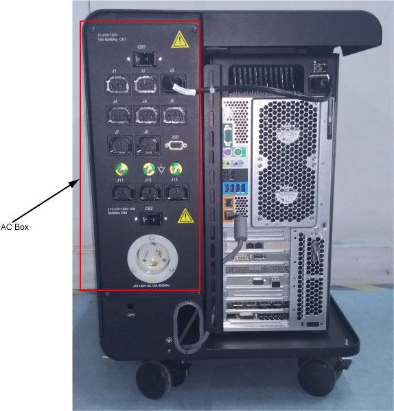 The AC Box in the top compartment of the Operator Console is responsible for distributing AC Power to the components in the Console. Incoming power from the AC Unit (PDU) of the CT System is single phase 120 Vac. This incoming phase AC power is routed through Line Filters and Circuit Breakers and then sent to numerous IEC power outlets in a load balanced manner.
