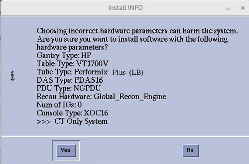 note: Install INFO detail in illustration will differ depending on System type. Verify that the Install INFO detail is correct for the system before selecting YES. - System Install INFO will be now used to create the CT Applications load routine.note: After clicking the Accept of reconfiguration, wait for a few seconds, then remove System State Backup Media from USB port. Do not remove the CT Software USB Flash Drive until it completes successfully.