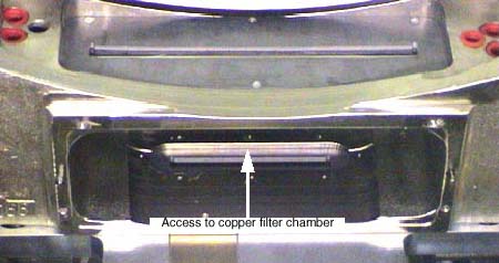 - Rotate gantry so collimator is at 6 o’clock and repeat step 8 cleaning. This is to ensure all loose particles are removed from Copper Filter Chamber.