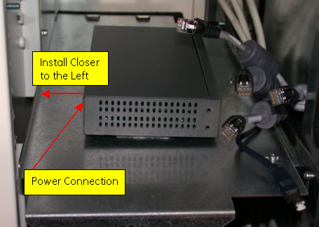 Mount the ethernet switch centered more to the left of the upper support bracket. Plugging in the power to the switch is also recommended before securing the switch to the Velcro.