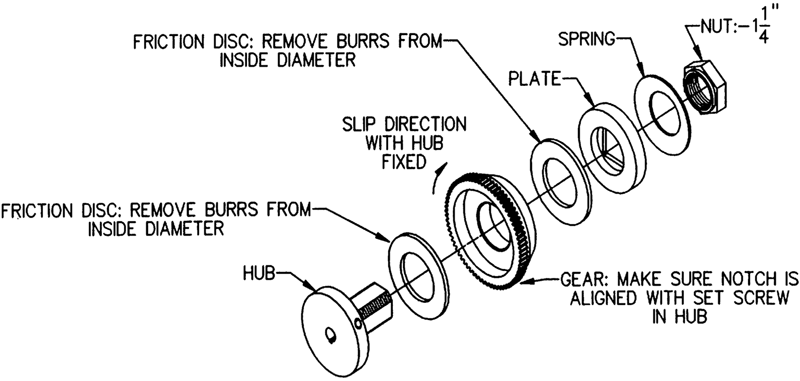 - Inspect the inside diameter of both friction washers for burrs. Remove any burrs with the sandpaper. Clean the dust and particles from the washers and then reassemble in reverse order; hand tighten the hex nut. Note that the friction washers are centered by the roller clutch that is pressed into the gear.