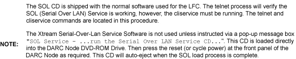 Load the SOL CD, if available, for current version of Software into the DARC2 Node and press the DARC Node reset switch (or re-power DARC2 Node if necessary). SOL CD will auto-eject when completed.