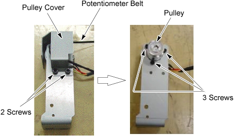 10. Loosen 2 screws that fasten the Potentiometer assembly to the Table frame, to remove the tension from the potentiometer belt, and remove the belt from the potentiometer pulley.