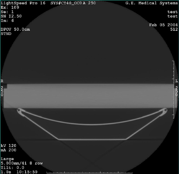 One of the new CTQ’s for the oncology customer is the importance of more accurate patient and image registration than is currently typical of general purpose CT systems. For radiation treatment (RT) planning purposes, it is desired to scan the patient on the CT scanner in the same position that will be used for radiation treatment. The gantry lasers are used to locate the patient in all 3 dimensions and thus the accuracy of the coronal and sagittal laser lights is just as important as the accuracy of the axial laser light. This procedure will characterize any necessary offset (used by firmware) to the gantry home flag to make sure the gantry positions the coronal lasers and the reconstructed images in a horizontal location to within tolerances required by oncology sites. This procedure must be run prior to adjusting the sagittal and coronal alignment lasers to make sure the gantry is positioning the lasers in the correct location. This procedure will adjust the gantry and laser light location together. A 400 mm line is used to determine the angular offset such that the vertical offset can be measured at a fixed distance to allow proper calculation of the rotational offset needed. This procedure can be run either with just the phantom or adding thin wire or location BB's (as used for radiation therapy planning) taped on top of the phantom for easier location of the measurements.