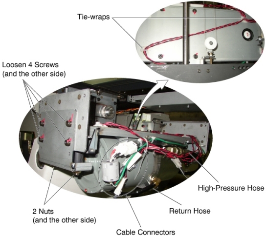 11. Cut any tie-wraps holding the cables to the upper frame of the pump assy.