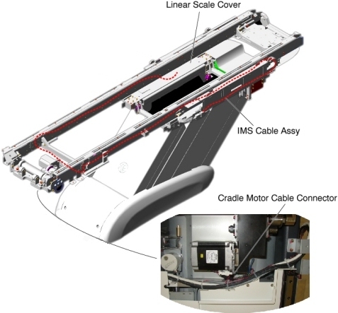 10. Cut any tie-wraps holding the IMS cable to the Table frame, and remove any clamps, then disconnect the cradle motor cable connector.