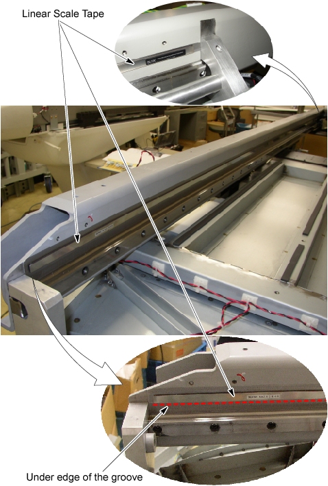 10. Peel off a paper from the new linear scale tape, and attach it along the under edge of the groove (see Figure 3).