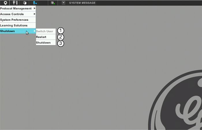 This procedure provides the instructional steps necessary to perform a shutdown. Shutdown being the orderly termination of both the OS and Applications software running on the scanner desktop, system cabinet and gantry. Shutdown is not to be confused with power down, additional steps are required to remove power from system. Refer to the System Safety Overview for detailed procedures for Equipment Service and LOTO.