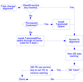 - There are two types of sites. The system with TubeInstall option (called permanent customer), the tube alignment process has no change. The other systems will require a TubeInstallFlex option eLicense to enable access tube alignment for 5 days. For either site, the tube alignment workflow for GE FE with Class M service key has no change.