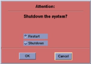 If Applications are up, select the Shutdown icon on the Attention screen (Figure 4), Restart, then OK.
