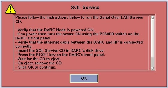 The Xtream Serial-Over-LAN Service Software is not used during the LFC unless instructed via a pop-up message box. This CD is loaded directly into the VDARC Node. Then press the reset (or cycle power) at the front panel of the VDARC Node as required. This CD will auto-eject when the SOL load process is complete.