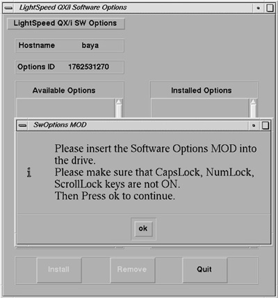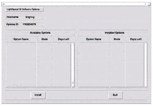 8. Select INSTALL. A message box may appear while the option loads. The option label appears in the Installed Options list, when installation completes. Be patient, as some options take a fraction of a second to install. Some may take minutes.