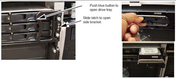 On each side of drive rack are brackets blocking some of the tray access. Slide the latch to release side bracket. Press the blue button on the front to open the drive tray front cover.