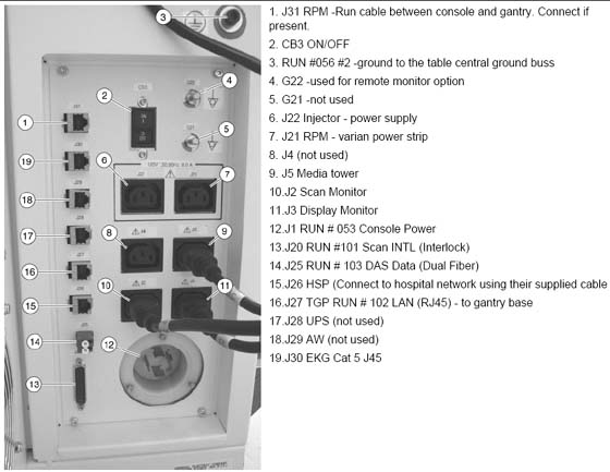 On the backside of the console, plug in the computer power cable (p/n 5314704) into the computer outlet. See (C) in Figure 18. Label this end of the power cord "VeRB" using supplied cable labels (p/n 5316747-3) Also check, and if necessary turn ON the computer power switch. See (D) in Figure 18.