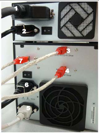 Connect the three USB cables to the rear of the media tower. Each USB Cable is labeled, plug the labeled cable end into the correct connector.