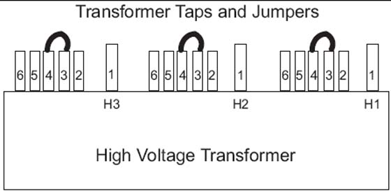 note:Taps should be shipped as shown for 480 VAC only. For all others, you must move the taps. The tap check should be completed by the mechanical installer.