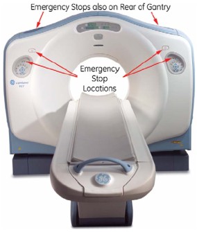 note:During the scan, it may be necessary to enter the scan room to obtain a better listening position. If so, keep a finger on one of the four E-STOP buttons (on the gantry), to quickly stop the gantry, if necessary.