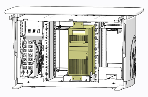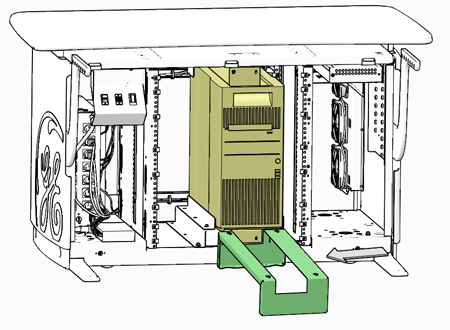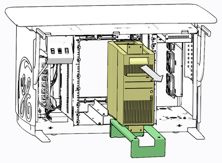 Remove necessary hardware from Console computer’s mounting brackets and slide the computer onto the service platform, using the handle built into the top surface of the computer’s chassis.