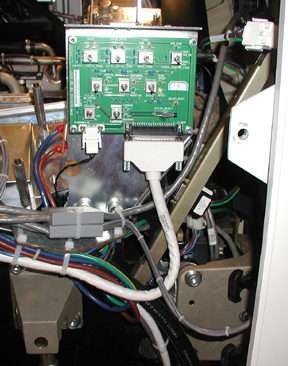 The Service switches are located on the right side of the gantry on the stationary base just above the rear cover cam latch. UP (enabled) is the normal operational position for these switches. The primary service safety switches are located across the top of the service switch panel.