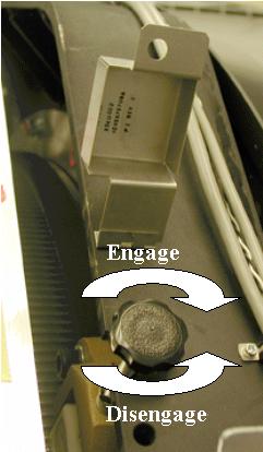 To Lock the gantry rotation, turn the handle clockwise until the teeth on the lock fully engage the teeth on the rotating assembly. If necessary, rock the rotating assembly slightly to align the teeth. Hand tighten until snug. Do not over-tighten. Visually verify that the teeth are engaged.
