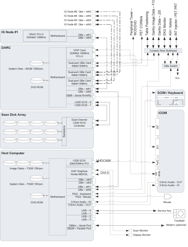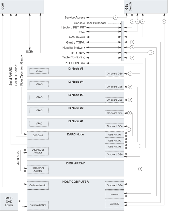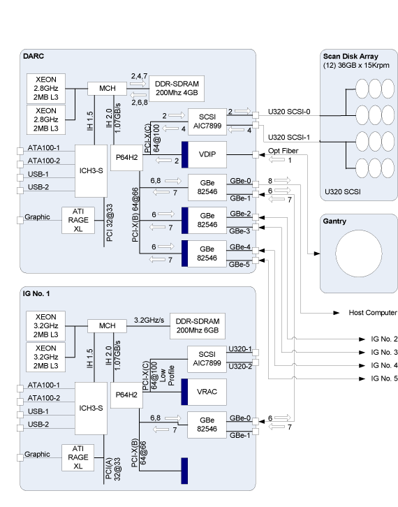 The high-speed Scan Data Disks are connected to the VDARC node via an internal Ultra320 SCSI bus. To increase the disk read/write speeds software RAID0 (striping) is employed. The Scan Data Disk configuration may change according to the number of detector slices, DAS trigger rates, and/or IG performance.