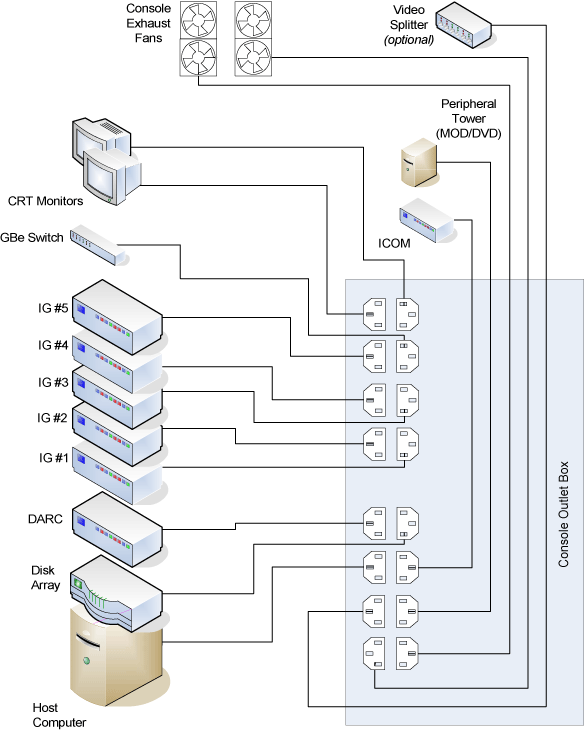 The VDARC, IG, nodes are each powered by an AC switching power supply internal to each chassis. Each node receives its AC power from a pair of 120Vac single-phase circuits in the outlet box internal to the console chassis.