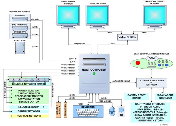 The Host Computer accomplishes these tasks by taking input from the user via keyboard, mouse and trackball and using this input along with the operating and application software loaded on the Host Computer to control and communicate with the component groups responsible for image generation, reconstruction and display. The Host Computer communicates via Gigabit Ethernet interface with the following.